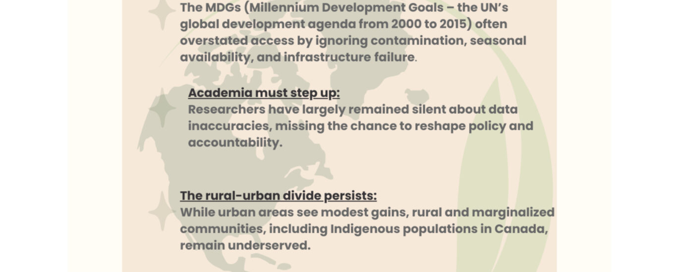 The MDGs (Millennium Development Goals – the UN’s global development agenda from 2000 to 2015) often overstated access by ignoring contamination, seasonal availability, and infrastructure failure.